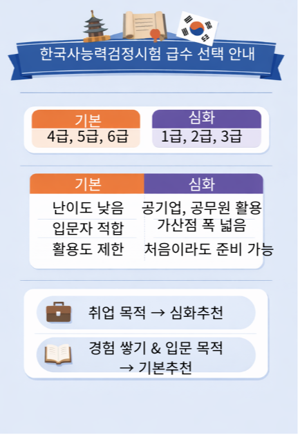 - 재취업 및 공무원 가산점이 목표라면? → [무조건 심화] 7급·9급 공무원 시험 대체, 공기업 채용 가산점, 교원임용시험 응시 자격 등은 대개 **'심화 3급 이상'**을 요구합니다. 기본 급수는 따 놓아도 실제 취업 시장에서는 인정되지 않는 경우가 허다해요. 힘들게 공부해서 딴 자격증이 '취미용'으로 남길 원치 않으신다면 무조건 심화를 선택하는 게 정답이에요.